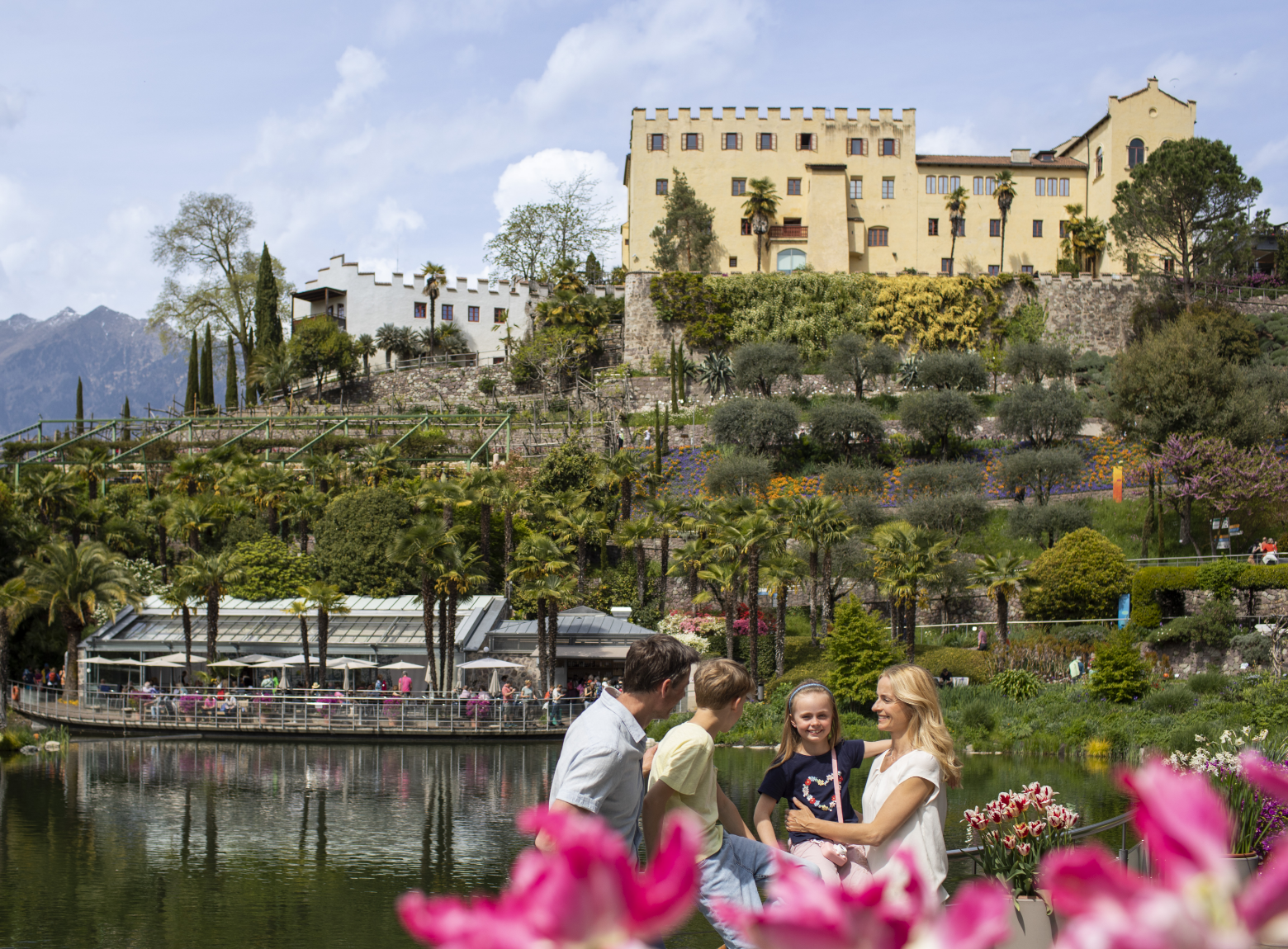 Die Gärten von Schloss Trauttmansdorff in Meran erstrecken sich auf 12 Hektar mit einem Höhenunterschied von 100 Metern. Das eröffnet spektakuläre Ausblicke auf die über 80 Gartenlandschaften, die umliegende Bergwelt und die Stadt Meran. Auf sanft geschwungenen Wegen geht es auf eine Reise durch vier Gartenwelten mit Pflanzen aus aller Welt, vorbei an sonnigen Terrassen und plätschernden Bächen.