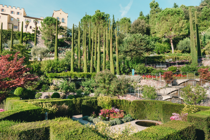 Die Gärten von Schloss Trauttmansdorff präsentieren auf einer Fläche von zwölf Hektar – unterteilt in vier Gartenwelten – über 80 Gartenlandschaften mit Pflanzen aus aller Welt.