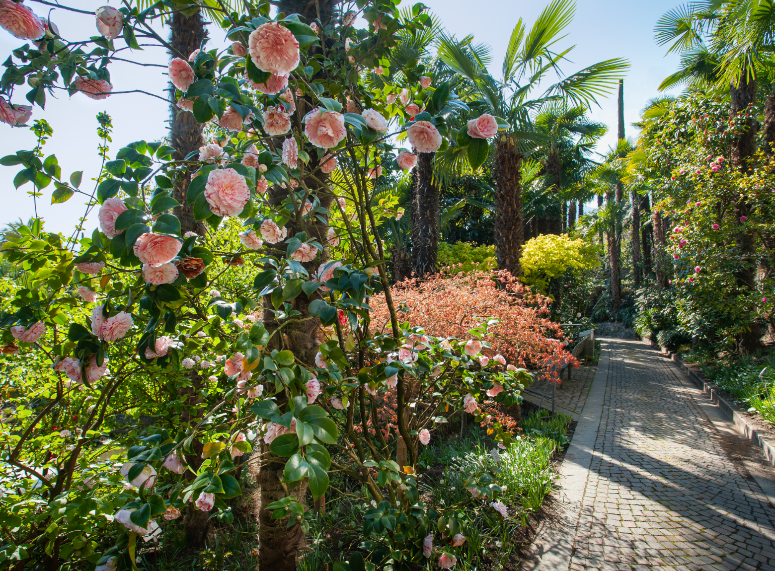 In the Palm Grove, among exotic species, camellias enhance the subtropical atmosphere. The combination of evergreen foliage, palms, and East Asian-inspired blooms creates a particularly evocative setting. The mild microclimate supports winter flowering, making them a seasonal highlight.