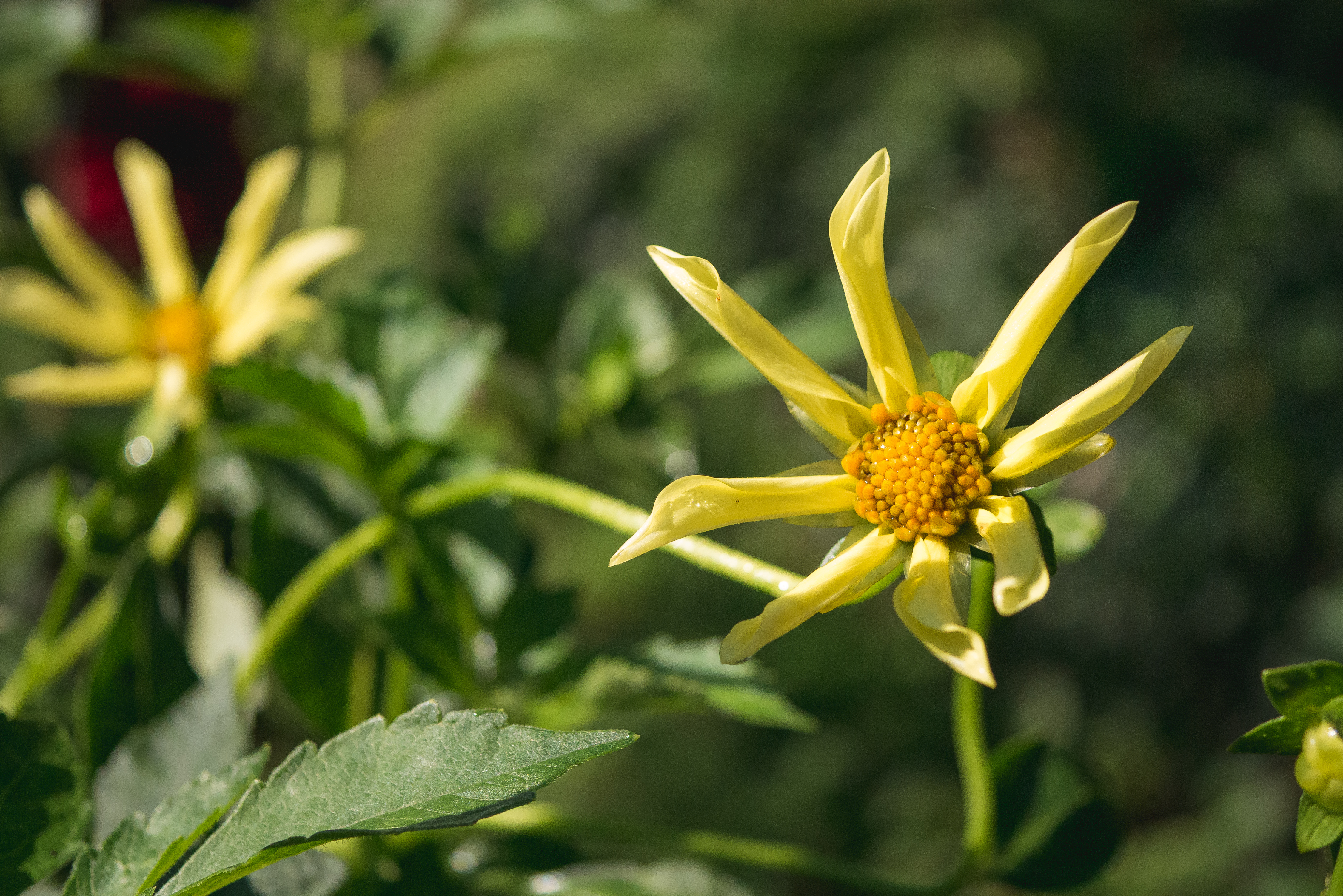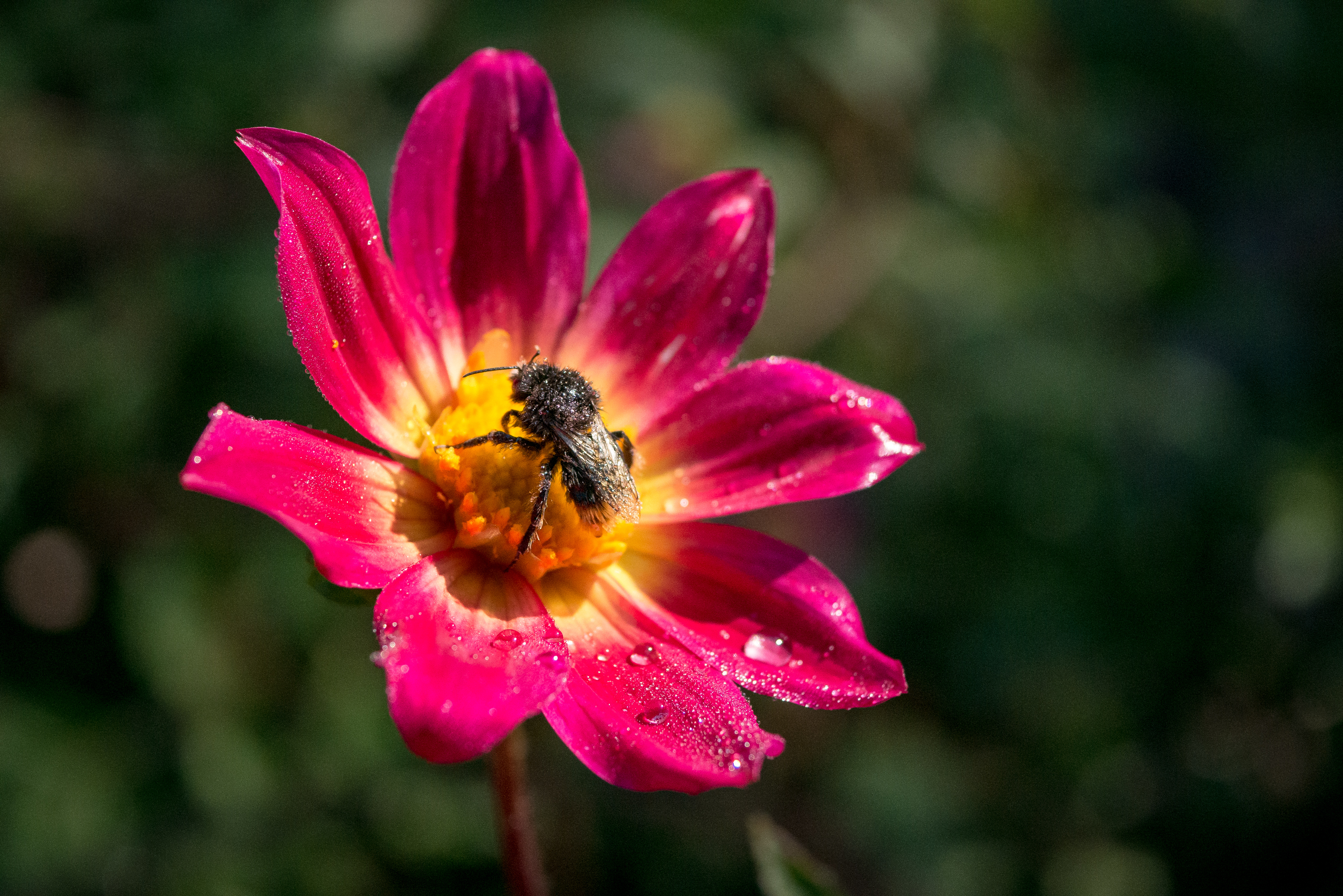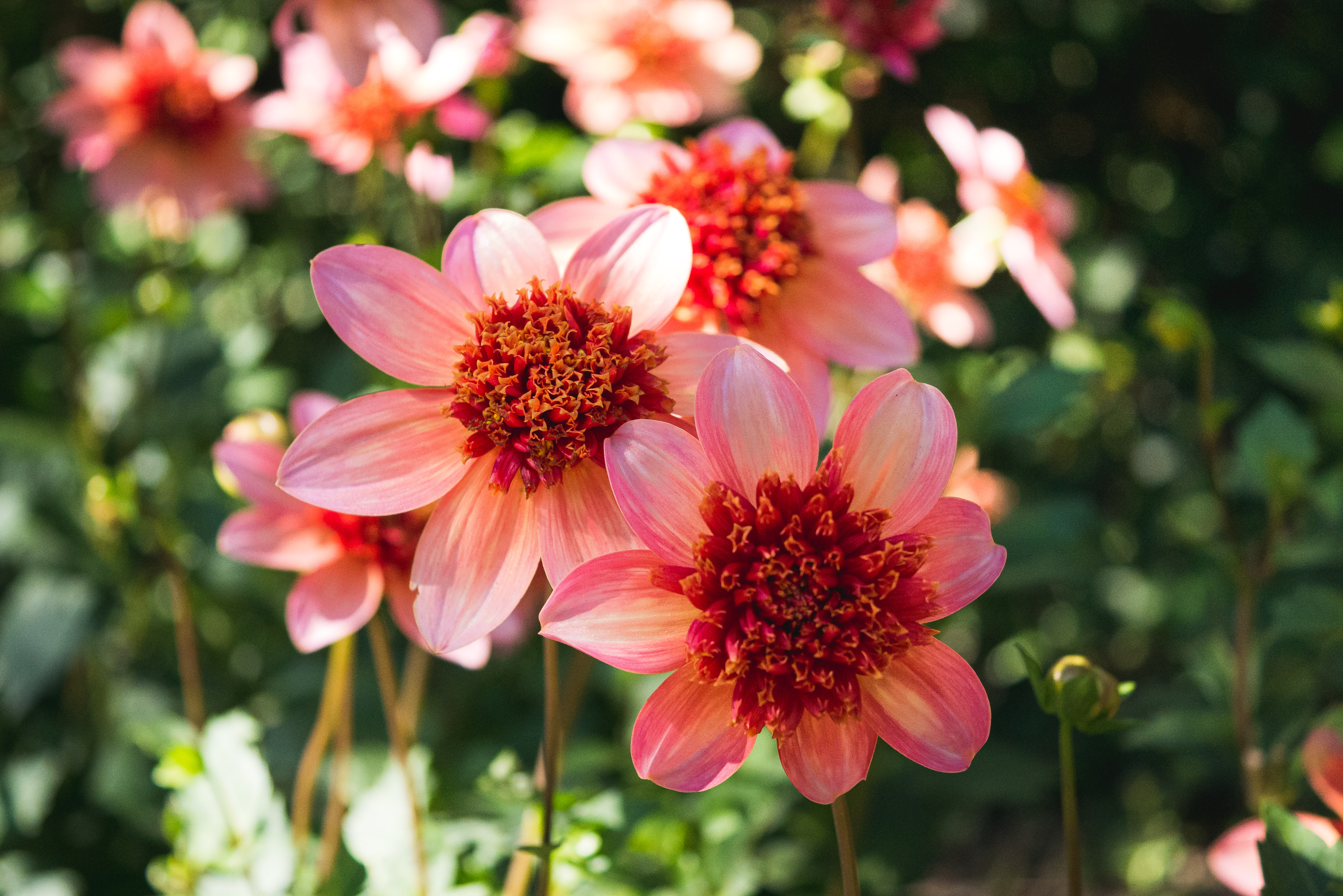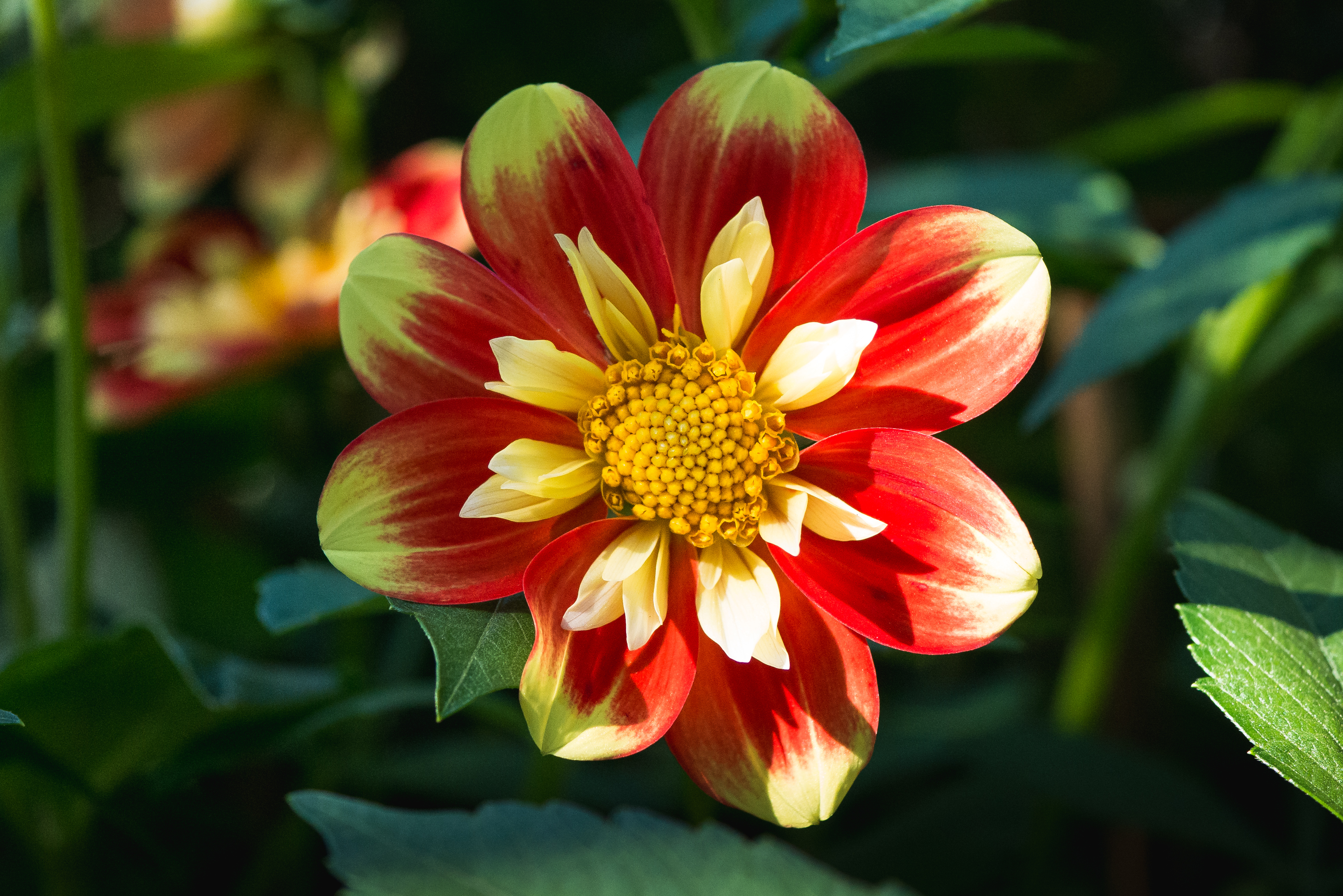 Ad eccezione dei toni del blu, i fiori delle dalie sfoggiano tutte le tonalità possibili di bianco, giallo, arancione, rosso, rosa, lilla, viola e possono essere anche variopinte. Quello che all'apparenza è un fiore singolo, in realtà dal punto di vista botanico è un'infiorescenza composta da tanti piccoli fiori riuniti in un "capolino" (caratteristica delle Composite o Asteraceae). Al centro si trovano i fiori tubulosi del disco, dai quali sporge lo stigma, circondati dai decorativi fiori del raggio (fiori ligulati). Questi ultimi si occupano, per così dire, della "promozione" e si fanno belli e appariscenti per attirare gli insetti impollinatori. Nelle dalie a capolino semplice i fiori del disco sono chiaramente visibili. Nelle varietà a capolino pieno i fiori ligulati sono così fitti che il disco non è visibile. Sono particolarmente attrattivi ma in realtà raramente offrono nutrimento agli in-setti.
