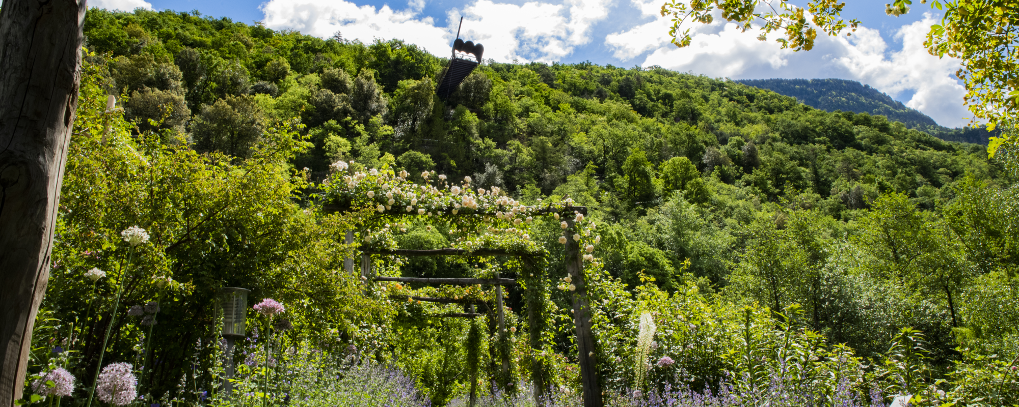 La palizzata intrecciata, tipica dell‘Alto Adige, è stata realizzata a mano da un contadino della vicina Val d‘Ultimo. Stretti camminamenti separano le diverse porzio¬ni di orto coltivate a insalata, carote, porro, cipolla e cavoli. Qua e là crescono anche profumate piante aromatiche e officinali.
